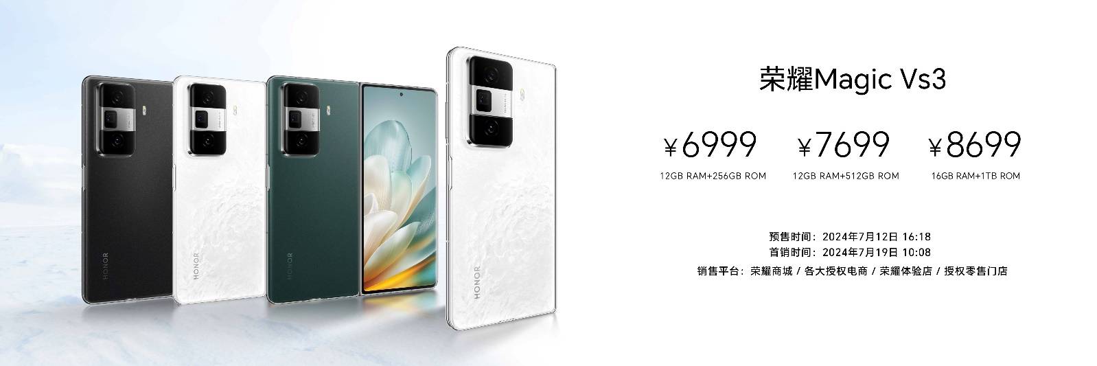 荣耀Magic V3和荣耀Magic Vs3将于2024年7月12日16:18开启预售,7月19日10:08在荣耀商城、各大授权电商、荣耀体验店、授权零售门店正式开售。其中荣耀Magic V3提供12GB+256GB、16 GB +512GB、16 GB +1TB三个容量版本,售价8999元起;荣耀Magic Vs3提供12 GB +256GB、12 GB +512GB、16 GB +1TB三个容量版本售价6999元起。