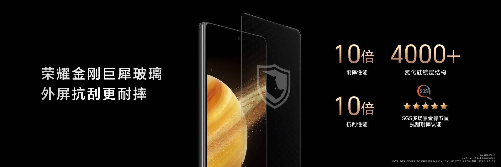 更为出色的是,荣耀Magic V3搭载的是轻薄折叠铰链结构,厚度仅有2.84毫米,采用强度高达2100Mpa的第二代荣耀盾构钢,抗冲击性能提升100%。手机机身更是业界首创航天特种纤维,抗冲击性能是iPhone 15 Pro Max的40倍。在屏幕保护上,荣耀Magic V3的外屏采用荣耀金刚巨犀玻璃,基于第二代纳米微晶玻璃技术,全场景抗跌能力提升了10倍,同时使用氮化硅镀晶技术,独创4000+叠层设计,实现10倍抗刮耐摔;内屏搭载荣耀金刚柔性装甲,通过抗冲硅凝胶材料+纳米级氧化铝涂层,耐磨和抗冲击性能分别提升5倍和20%。此外,荣耀MagicV3的荣耀鲁班铰链经过了50万次折叠测试,1万次弯折测试后,屏幕折痕深度控制出色,仅为78微米;且产品支持IPX8防水等级,成为唯一通过2.5米防水认证的折叠屏手机,为用户提供了全面、安心的折叠屏使用体验。