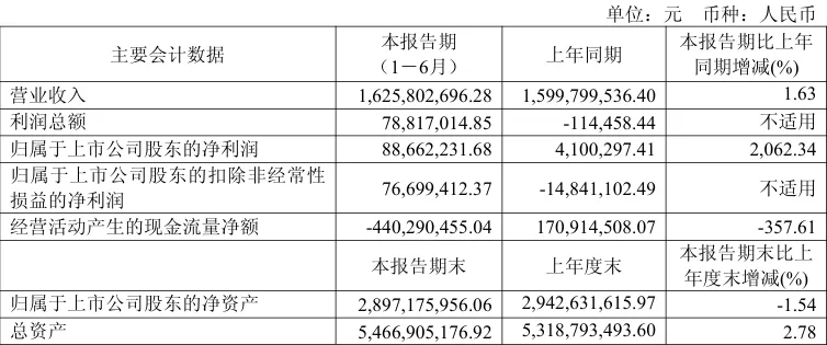 报告显示,今年上半年,公司营收为16.26亿元,同比增长1.63%;归母净利润为8866.22万元,同比暴增2062.34%。
