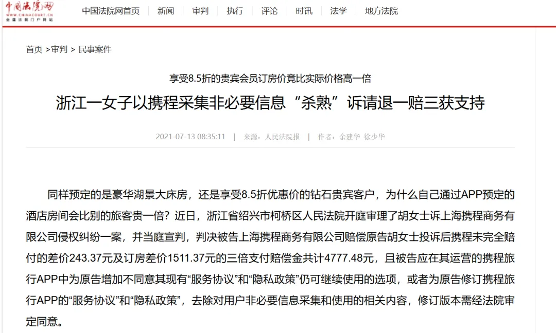 近日,浙江省绍兴市柯桥区人民法院开庭审理了胡女士诉上海携程商务有限公司侵权纠纷一案,并当庭宣判,判决被告上海携程商务有限公司赔偿原告胡女士投诉后携程未完全赔付的差价243.37元及订房差价1511.37元的三倍支付赔偿金共计4777.48元,且被告应在其运营的携程旅行APP中为原告增加不同意其现有“服务协议”和“隐私政策”仍可继续使用的选项,或者为原告修订携程旅行APP的“服务协议”和“隐私政策”,去除对用户非必要信息采集和使用的相关内容,修订版本需经法院审定同意。