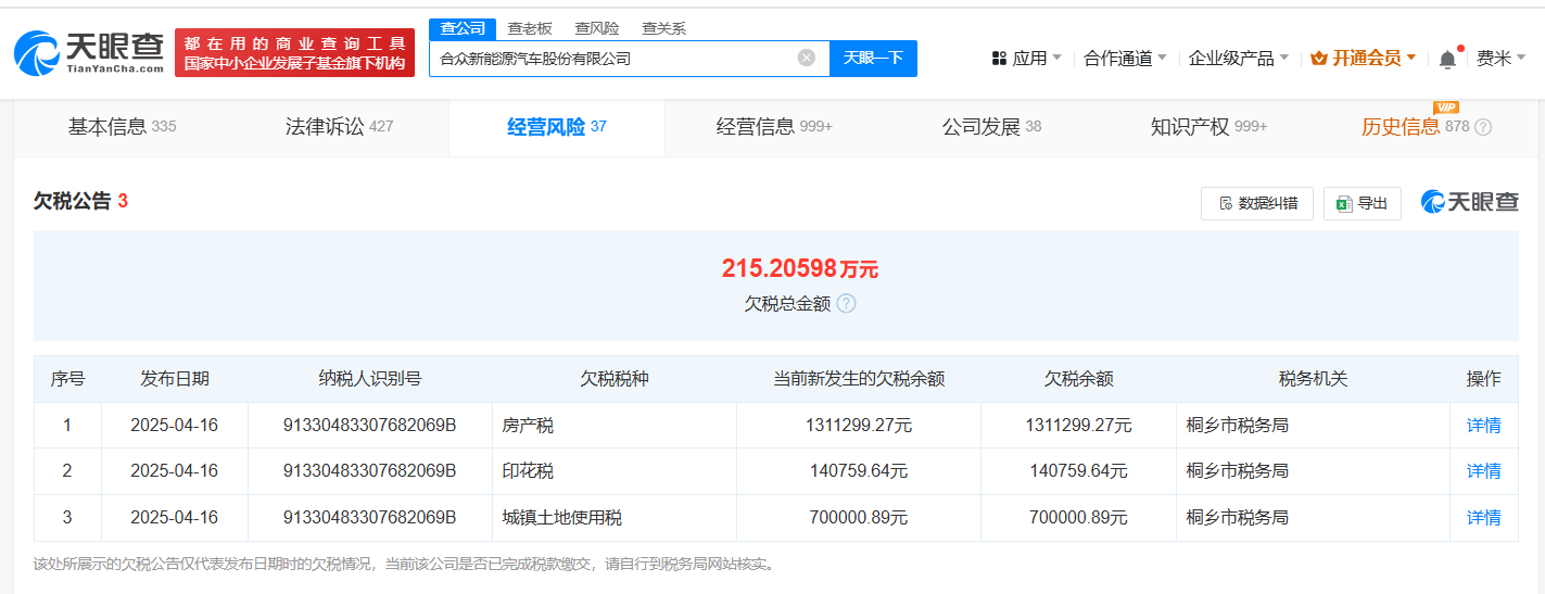 近日,哪吒汽车关联公司合众新能源汽车股份有限公司新增三则欠税公告,欠税总金额为215万余元,当前新发生的欠税余额合计215万余元,欠税税种为城镇土地使用税、印花税、房产税。