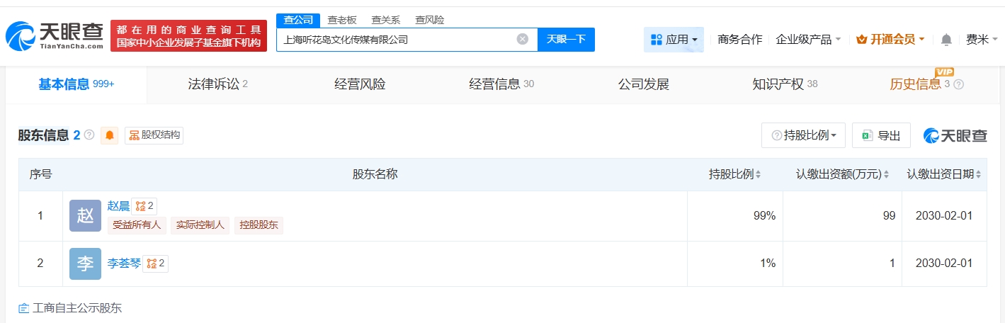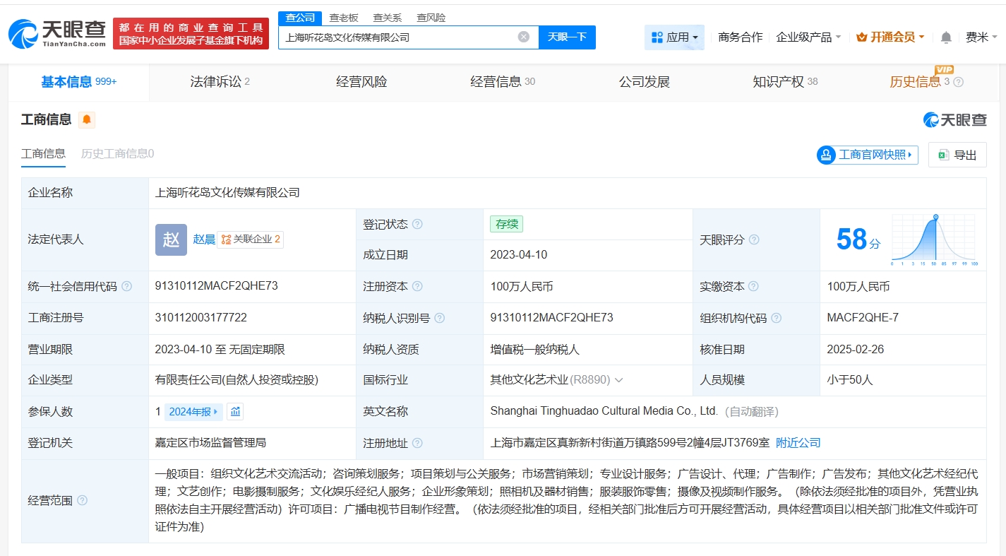 天眼查App显示,该剧出品方听花岛关联公司上海听花岛文化传媒有限公司成立于2023年4月,法定代表人为赵晨,注册资本100万人民币,经营范围包括组织文化艺术交流活动、广播电视节目制作经营、电影摄制服务等。股东信息显示,该公司由赵晨、李荟琴共同持股。知识产权信息显示,该公司曾登记“我在八零年代当后妈”、“家里家外2”等多款热播短剧作品著作权。