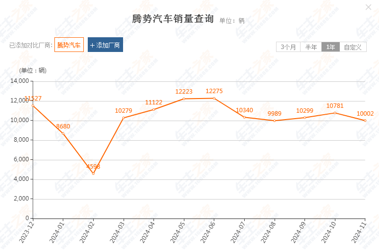 相关数据显示,腾势品牌11月销量为10002辆,同比下滑15.5%,环比下滑7%。