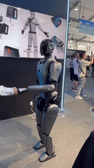 现场一机器人会进行握手、碰拳等简单动作。工作人员透露,未来该机器人通过训练,还能做一些文娱工作,比如跳舞。