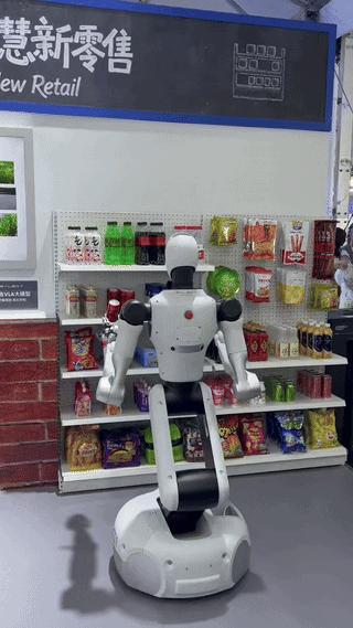 目前,展馆出现的这台机器人,能够接收顾客通过平板提交的下单信息,并前往货架拿取下单商品,再返回收银台给到顾客。这个过程中的动作,还算连贯、标准。