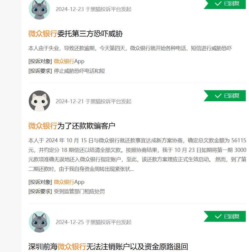 据黑猫投诉查询得知,微众银行除了被人假冒打骚扰电话外,可能也存在着暴力催收相关的问题。