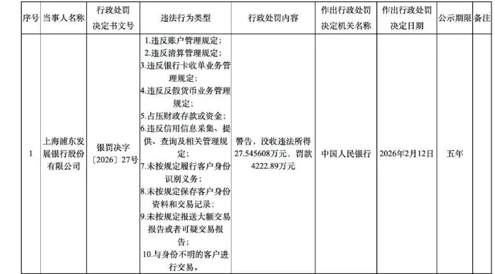 2026年初,央行对浦发银行开出了4250万元罚单,同时勒令其三家村镇银行的集体解散。