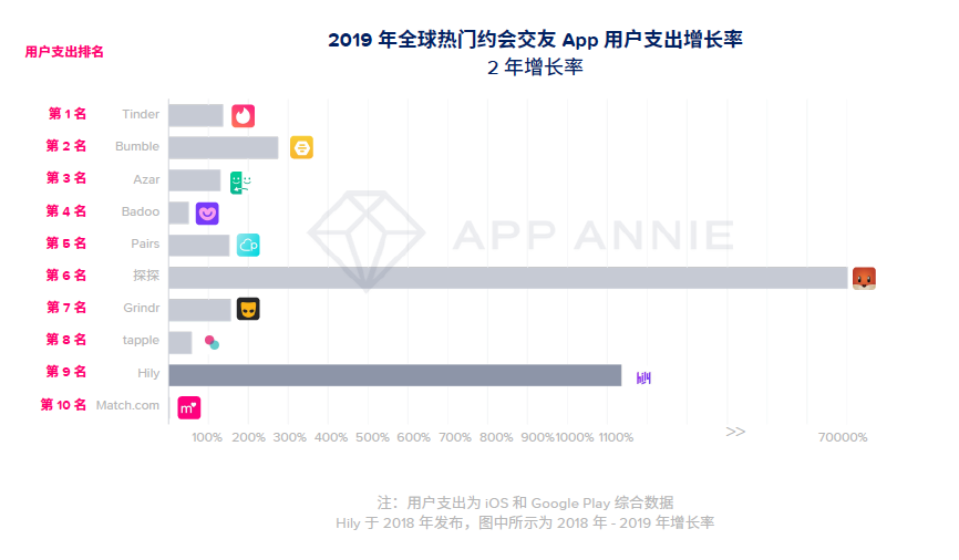 2018年,陌陌全资收购探探,除了不断巩固双方在国内开放式社交平台的领军地位,探探也一直在加强对海外市场的渗透。AppAnnie《移动市场报告2020》显示,2019年约会交友App用户支出超过22亿美元,在2019年全球热门约会交友 App 用户支出增长率2年增长率榜单里,探探位列全球第六,两年用户支出增长率达700%。