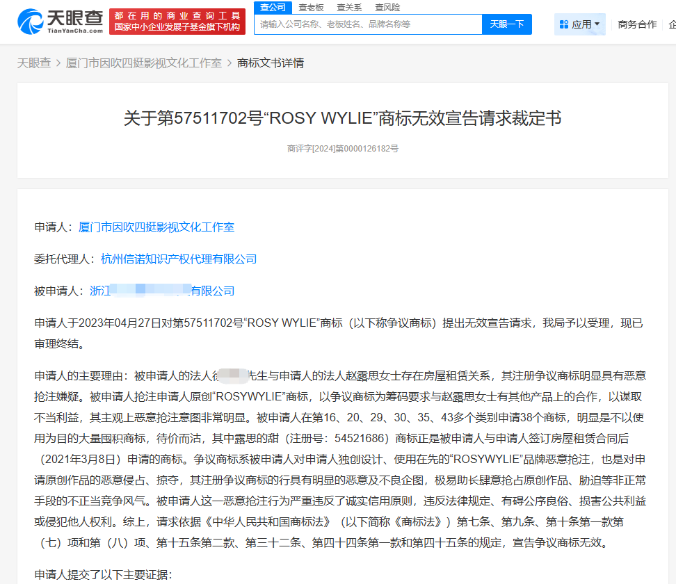 天眼查App显示,赵露思名下关联2家工作室,仅厦门市因吹四挺影视文化工作室为存续状态。值得注意的是,厦门市因吹四挺影视文化工作室曾申请某公司的“ROSY WYLIE”商标无效。文书内容显示,申请人称,被申请人的法定代表人徐某某与赵露思存在房屋租赁关系,其注册争议商标明显具有恶意抢注嫌疑。被申请人抢注申请人原创“ROSY WYLIE”商标,以争议商标为筹码要求与赵露思有其他产品上的合作,以谋取不当利益,其主观恶意抢注意图明显。商标局经审理查明,被申请人与申请人之间存在租赁关系,对被申请人在先使用的“ROSY WYLIE”应当知晓。被申请人申请注册的52件商标中包含3件“露思の甜”、9件“ROSY WYLIE”商标,上述商标均与申请人的法定代表人赵露思存在关系,难谓巧合。被申请人的行为具有明显的主观恶意,不具备正当性,且扰乱了公平竞争的市场秩序。根据商标法规定,争议商标予以无效宣告。
