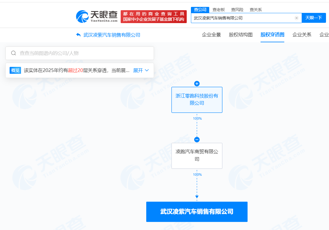 天眼查App显示,近日,武汉凌紫汽车销售有限公司成立,法定代表人为胡晨,注册资本300万人民币,经营范围含汽车销售、汽车零配件零售、机动车修理和维护、充电桩销售、电力电子元器件制造、发电机及发电机组销售等。股权全景穿透图显示,该公司由零跑汽车(HK.09863)旗下凌跑汽车商贸有限公司全资持股。