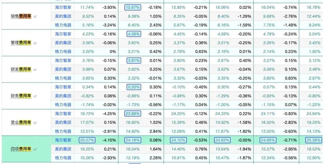 2024年年报显示,海尔的销售费用率高达11.7%,管理费用率达4.2%。根据理杏仁平台统计,海尔智家的销售、管理、研发和营业四项费用率合计曾达到24.18%(2023年数据),而同期美的为16.92%,格力仅为14.92%。