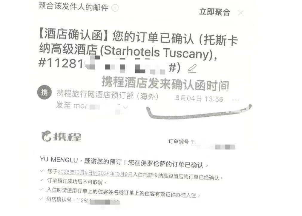 于女士告诉信号新闻,为了准备10月份的意大利之行,她在8月4日登录携程,准备预订佛罗伦萨托斯卡纳高级酒店(Starhotels Tuscany) 的房间。“我的计划是预订可退房型,因为签证尚未办理,必须预留退改空间,但操作时误选了一个‘家庭连通房’套餐。”于女士说,她马上发现这个套餐带着“不可取消”的备注。