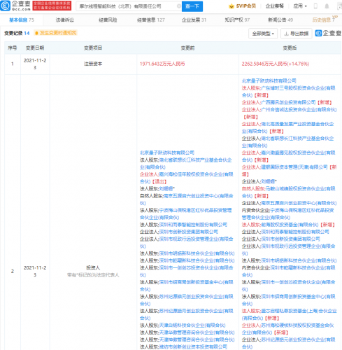 【TechWeb】企查查APP显示,11月23日,摩尔线程智能科技(北京)有限责任公司发生工商变更,新增广西腾讯创业投资有限公司等多名股东,同时公司注册资本由1971.64万元人民币增加至2262.58万元人民币,增幅为14.76%。