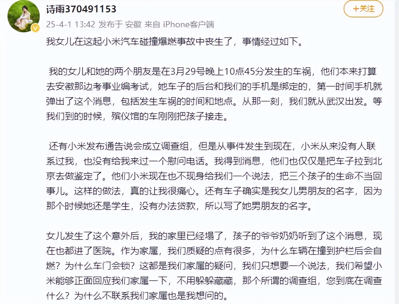 4月1日,遇难者母亲在微博发文,讲述了事件经过。并表示“小米发布通告说会成立调查组,但是从事件发生到现在,小米从来没有人联系过她,也没有来过一个慰问电话。“