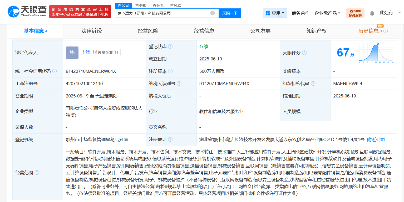 天眼查App显示,近日,萝卜运力(鄂州)科技有限公司成立,法定代表人为毕然,注册资本500万人民币,经营范围含,人工智能应用软件开发、人工智能基础软件开发、计算机系统服务、互联网数据服务、数据处理和存储支持服务、信息系统集成服务、信息系统运行维护服务等,由萝卜快跑关联公司萝卜运力(北京)科技有限公司全资持股。