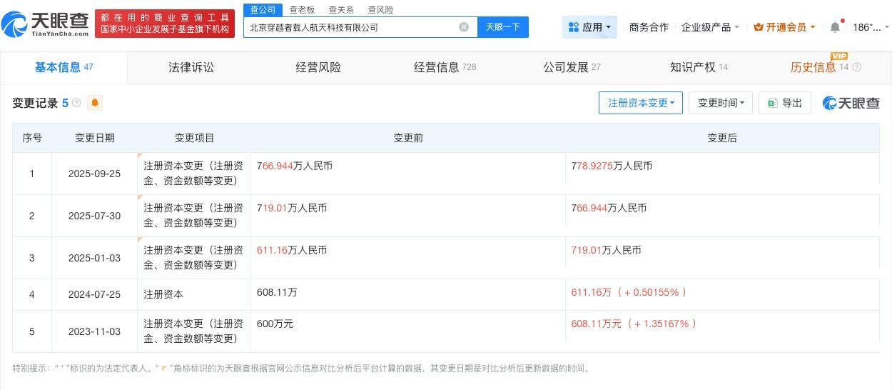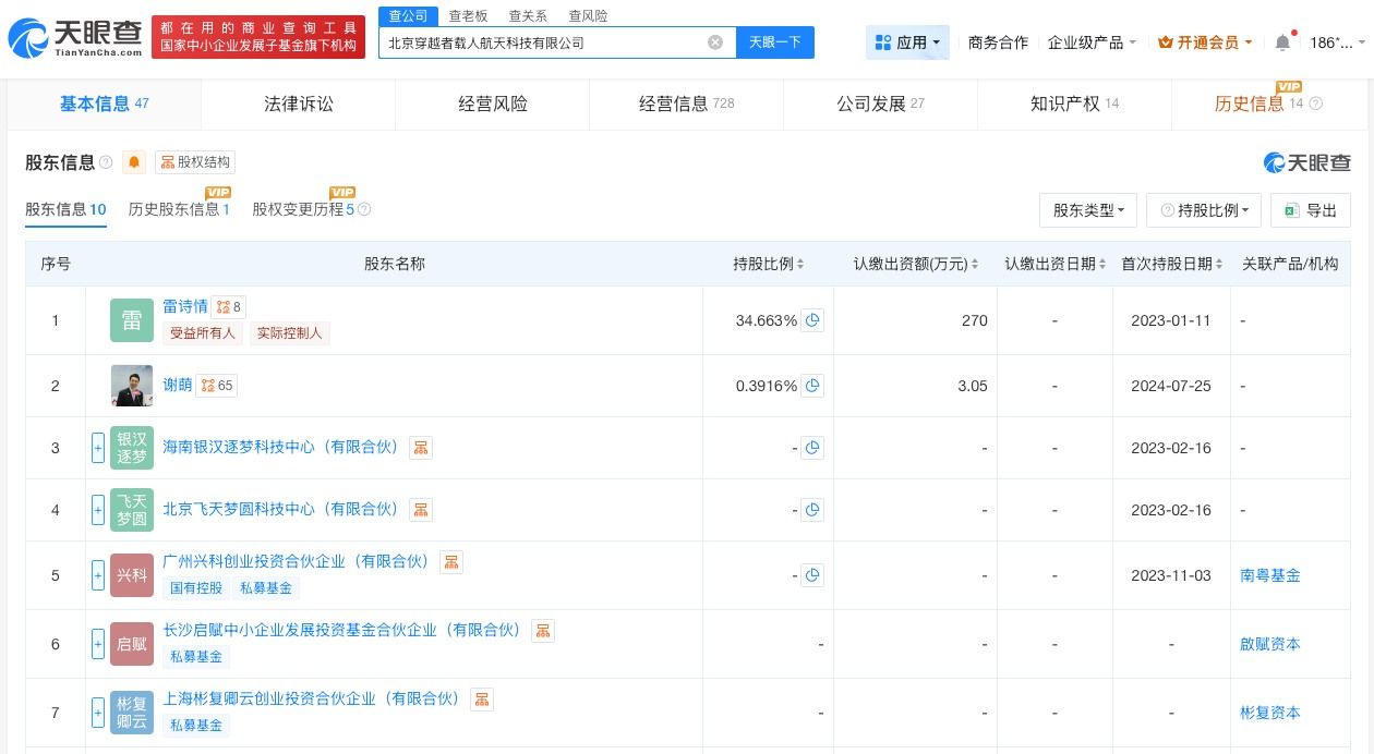 天眼查工商信息显示,“穿越者壹号(CYZ1)”关联北京穿越者载人航天科技有限公司成立于2023年1月,法定代表人为雷诗情,注册资本778.9万人民币,经营范围包括民用航空器零部件设计和生产、火箭发射设备研发和制造、飞行训练、火箭发动机研发与制造、民用航空器维修等。股东信息显示,该公司由雷诗情、谢萌、海南银汉逐梦科技中心(有限合伙)等共同持股。变更记录显示,2025年该公司曾多次增资。