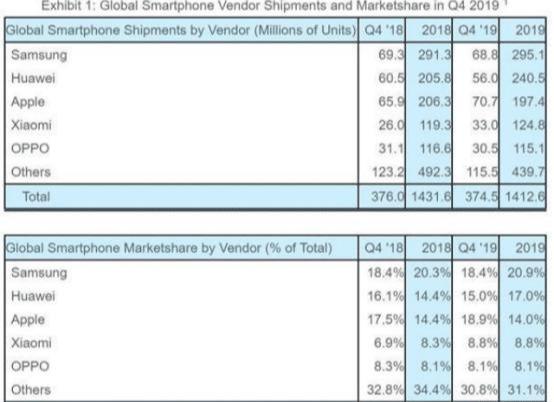 据相关媒体数据显示,在智能手机出货量排名中三星、华为、苹果、小米与OPPO分别为世界前五名,据统计他们的市场总额已经达到68.9%,还记得之前榜单中的vivo智能手机吗?现在销量已经下滑到其他手机厂商之列了。