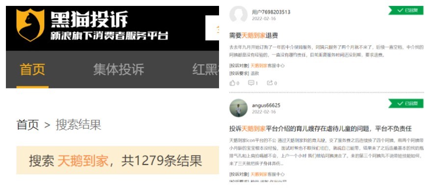 以天鹅到家为例,在黑猫投诉上搜索天鹅到家可以发现,关于天鹅到家的投诉结果有1279条,如果搜索58到家的投诉结果也有上千条,其中包括恶意扣费、服务不正规、霸王条款以及月嫂虐待儿童等各种投诉原因。