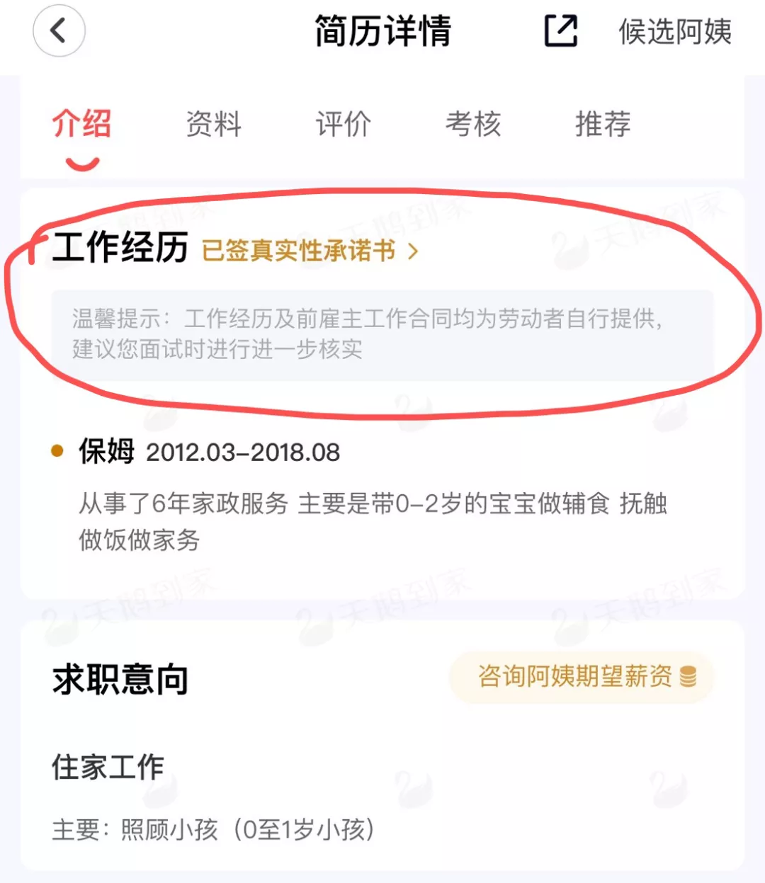 在天鹅到家APP上可以看到,只要打开阿姨的简历,在其工作经历的下方就会有灰色小字提示,“工作经历及前雇主工作合同均为劳动者自行提供,建议您面试时进行进一步核实。”
