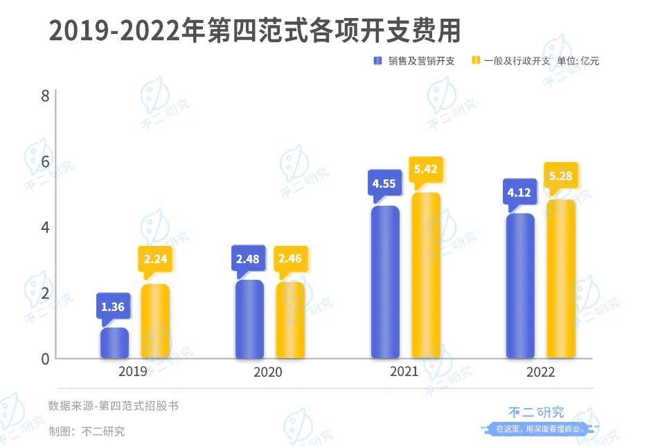 在2019年-2022年,销售及营销开支分别为1.36亿元、2.48亿元、4.55亿元、4.12亿元;一般及行政开支分别为2.24亿元、2.46亿元、5.42亿元、5.28亿元。