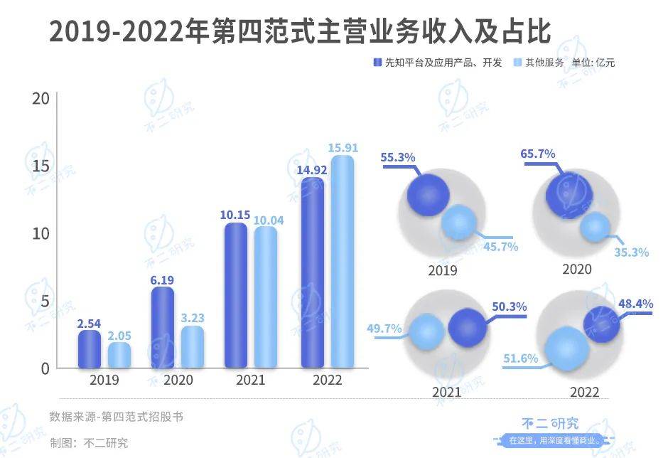 2019年-2022年,其先知平台及产品收入分别为分别为2.54亿元、6.19亿元、10.15亿元和14.92亿元,占总收入的55.3%、65.7%、50.3%和48.4%。