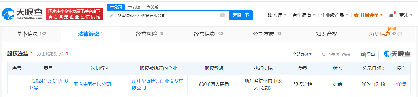 近日,顾家集团有限公司新增三则股权冻结信息,股权被执行的企业分别为浙江浙商产融投资合伙企业(有限合伙)、杭州爱租投资合伙企业(有限合伙)、浙江华睿德银创业投资有限公司,冻结股权数额合计约1.18亿人民币,冻结期限均为三年,执行法院均为杭州市中级人民法院。