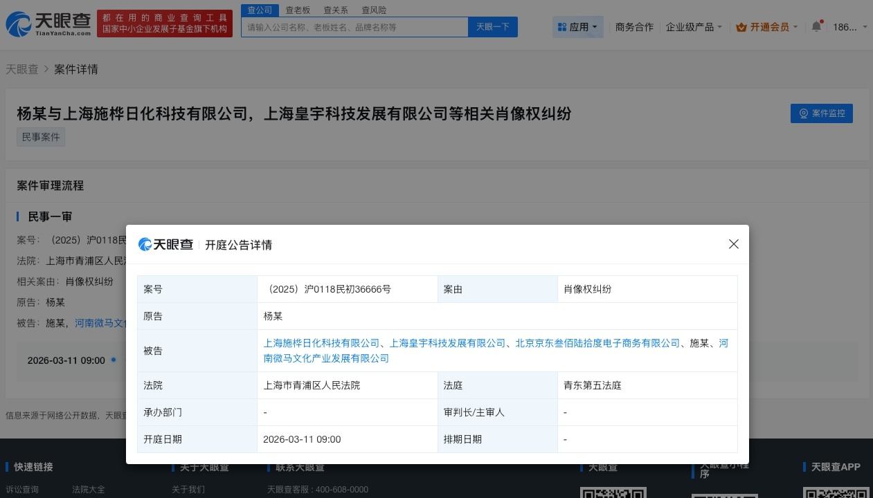 天眼查App显示,杨紫与上海施桦日化科技有限公司、上海皇宇科技发展有限公司等肖像权纠纷案件现存1则开庭公告,原告为杨紫,该案将于3月11日在上海市青浦区人民法院开庭审理。