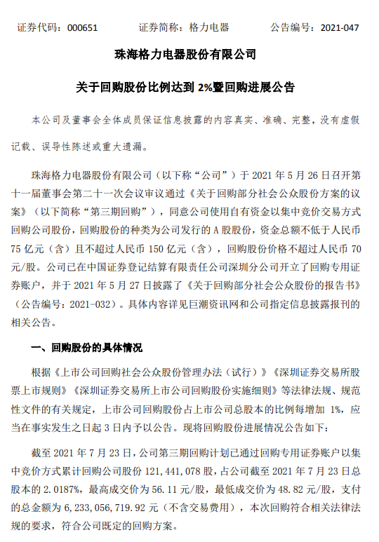 格力电器:已累计回购股份1.21亿股 耗资62.33亿元快报