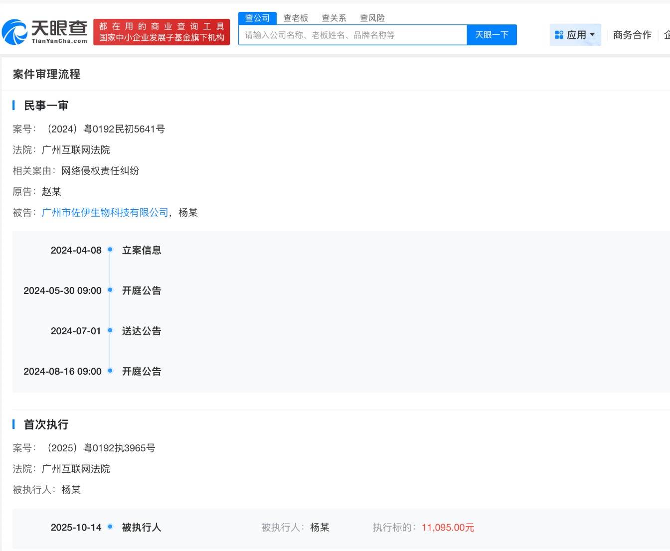 天眼查天眼风险信息显示,近日,杨某某新增一则被执行人信息,执行标的1.1万余元,涉及与赵丽颖相关网络侵权责任纠纷案件,执行法院为广州互联网法院。