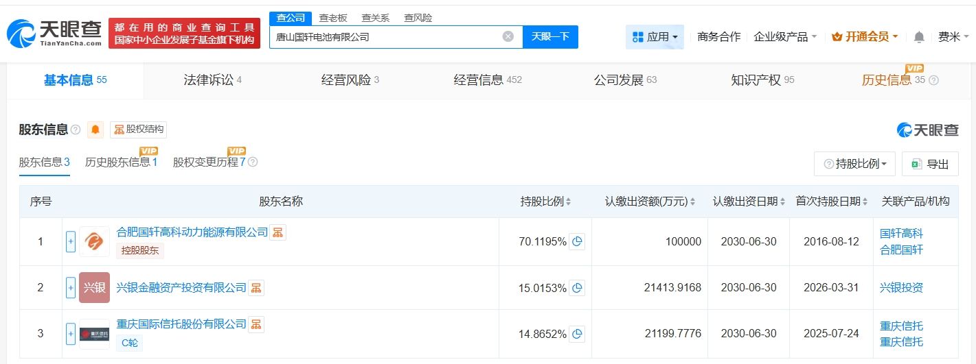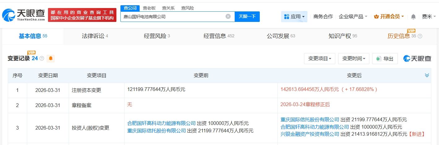 天眼查App显示,近日,唐山国轩电池有限公司发生工商变更,新增兴银金融资产投资有限公司为股东,同时,注册资本由约12.1亿人民币增至约14.3亿人民币,增幅约18%。