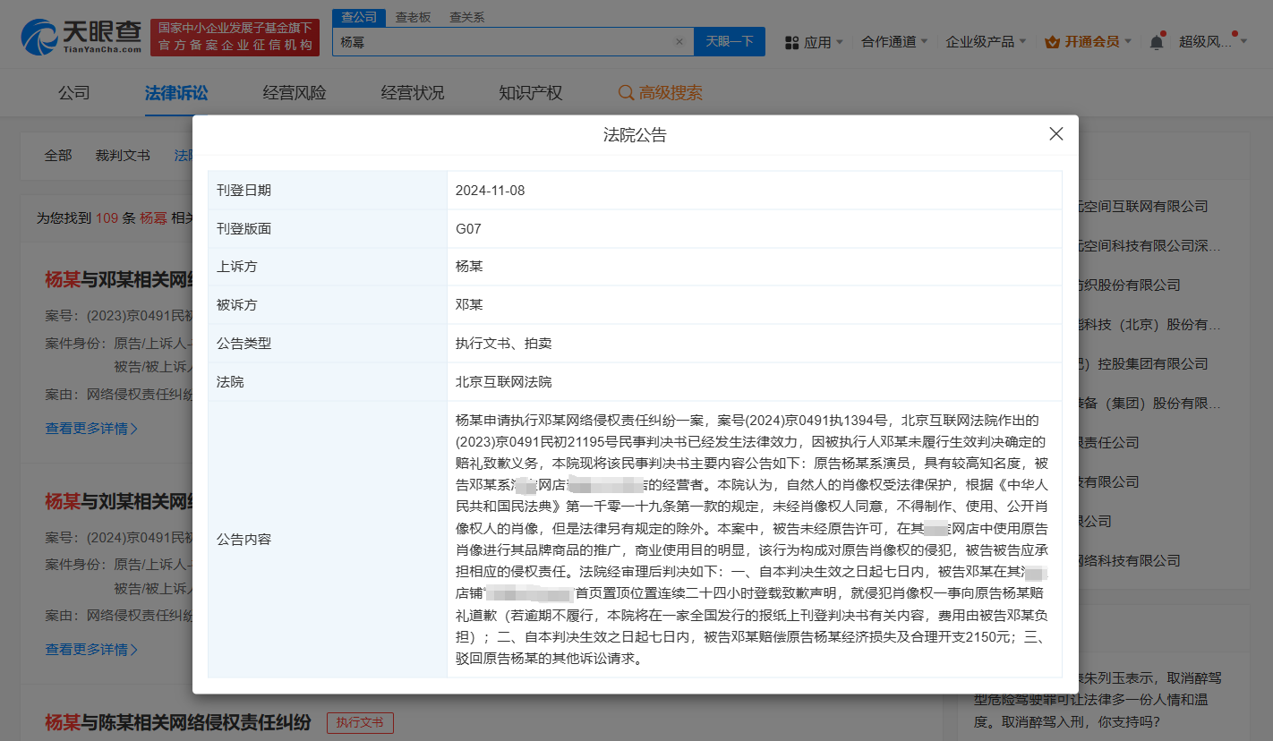 天眼查App显示,近日,因邓某某未履行生效判决确定的赔礼致歉义务,北京互联网法院公告杨幂与其网络侵权责任纠纷一案判决书。公告显示,被告邓某某系一网店经营者,其未经原告杨幂许可,在网店中使用原告肖像进行品牌商品的推广,商业使用目的明显,构成对原告肖像权的侵犯。法院判决邓某某公开道歉并赔偿经济损失及合理开支2150元。案件流程信息显示,今年5月,邓某某已因此案被强制执行。