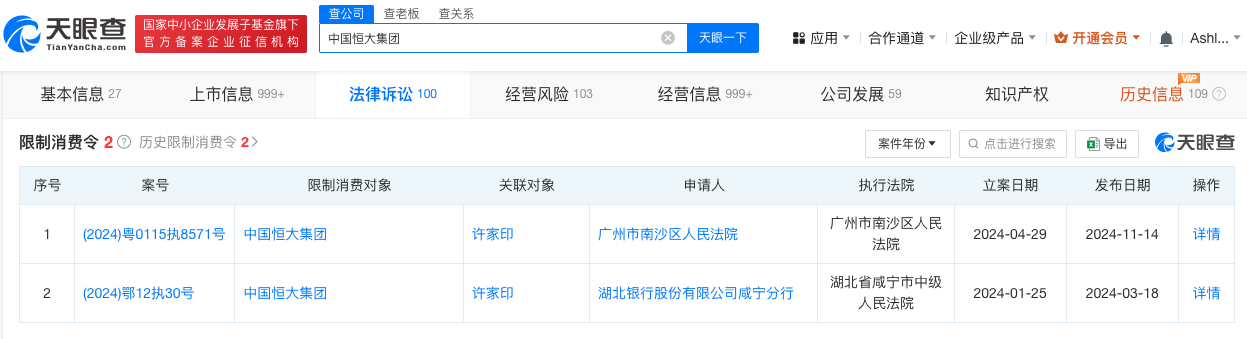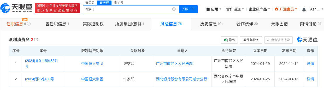 天眼查法律诉讼信息显示,今年以来,中国恒大集团及许家印已两次被限制高消费,申请人分别为湖北银行股份有限公司咸宁分行、广州市南沙区人民法院,涉及金融借款合同纠纷、公司债券交易纠纷案件。天眼风险信息显示,中国恒大集团现存10余条被执行人信息,被执行总金额超111亿元。