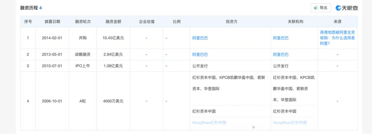 天眼查APP显示,当年高德被阿里并购时融资10.45亿美元。相比当年,今天的高德地图的估值可能会更高。