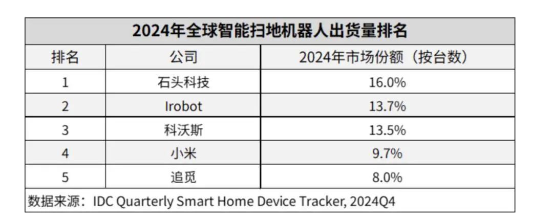 IDC报告亦印证了它在市场上的地位:2025年二季度,石头科技以15.2%的份额领跑全球清洁电器市场,在扫地机器人单一品类中更是以20.7%的份额居全球第一。
