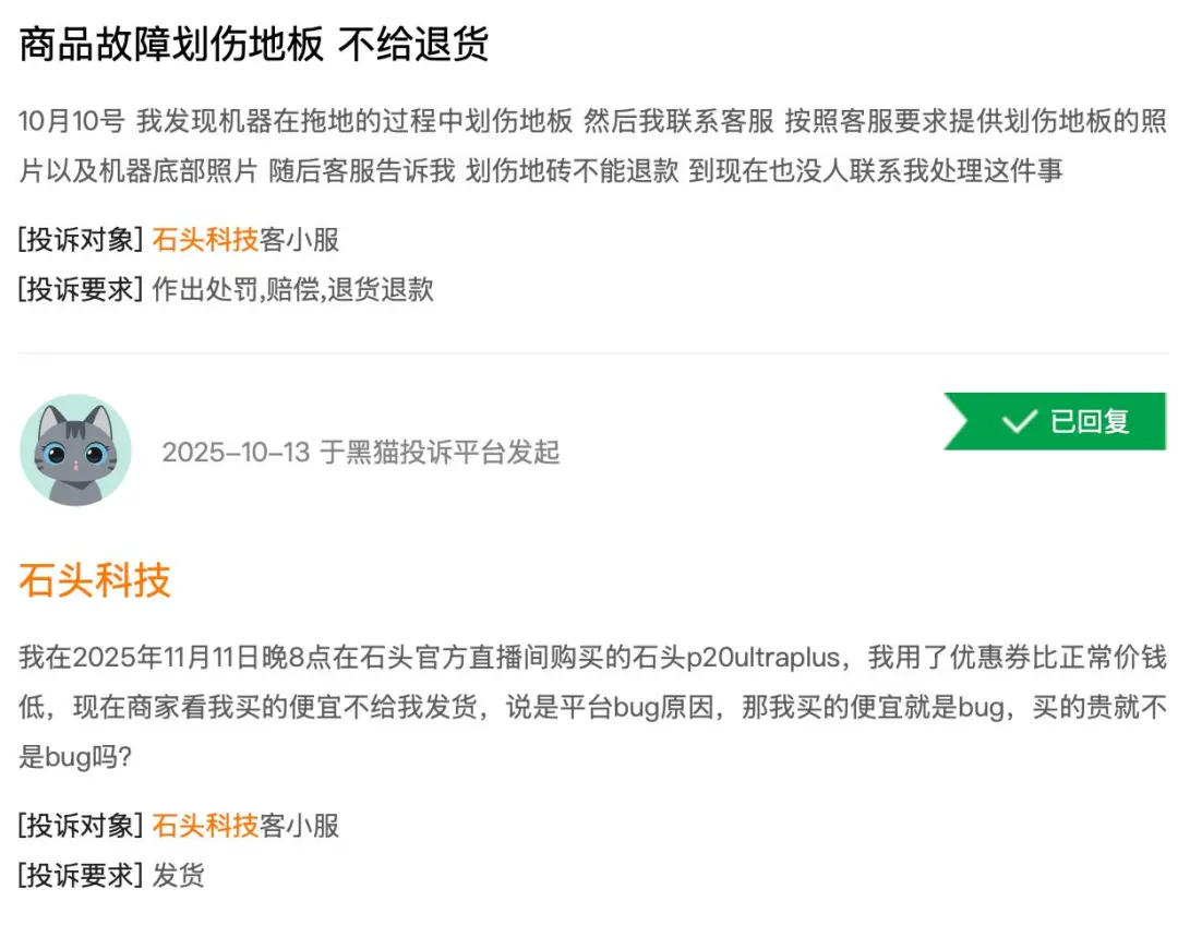 黑猫投诉平台数据显示,与“石头科技”相关的投诉量已超过2700条,问题集中在产品质量与售后服务。
