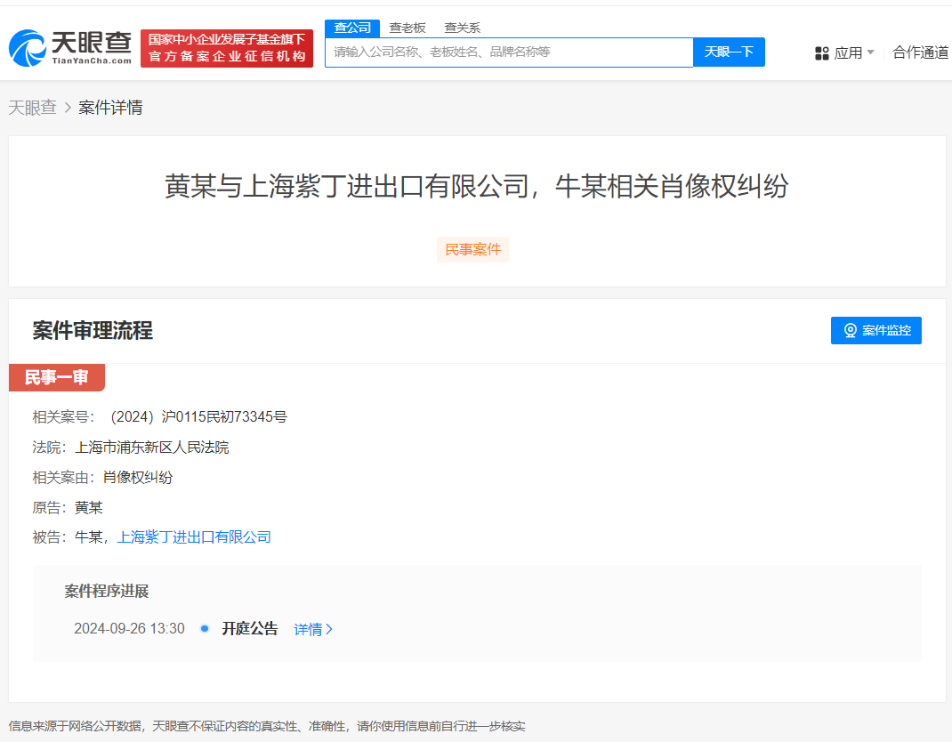 天眼查法律诉讼信息显示,近日,黄渤与牛某、上海紫丁进出口有限公司相关肖像权纠纷案件新增开庭公告,原告为黄渤,该案将于9月26日在上海市浦东新区人民法院开庭审理。