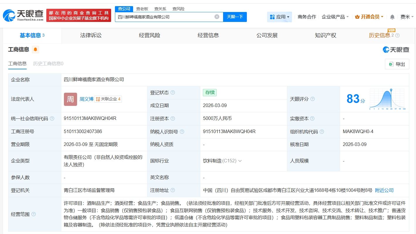天眼查App显示,近日,四川鲜啤福鹿家酒业有限公司成立,法定代表人为周义博,注册资本5000万人民币,经营范围包括酒制品生产、酒类经营、食品生产、食品销售等。