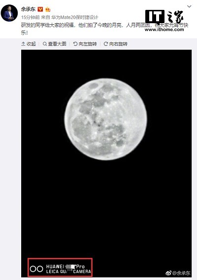 2月19日消息 今日正逢元宵佳节,农历十五月正圆。刚才,华为消费者业务CEO余承东在微博上晒出了一张拍月亮照片,尽管照片上打了一些“马赛克”,但还是依稀显露出了拍摄样张所用的手机。