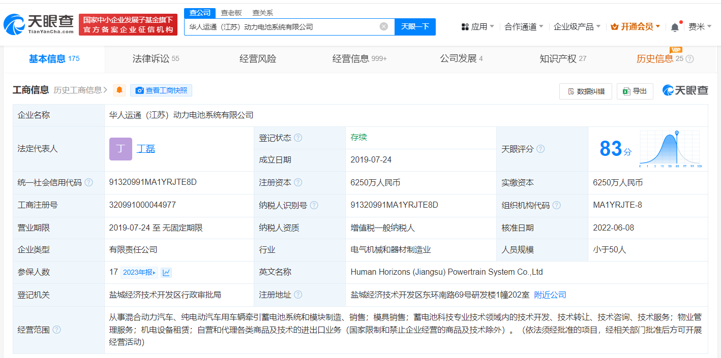 华人运通(江苏)动力电池系统有限公司成立于2019年7月,注册资本6250万人民币,经营范围包括从事混合动力汽车、纯电动汽车用车辆牵引蓄电池系统和模块制造、销售等,由华人运通(江苏)技术有限公司、盐城经济技术开发区东海岸智能交通产业投资合伙企业(有限合伙)、东软睿驰汽车技术(沈阳)有限公司共同持股。
