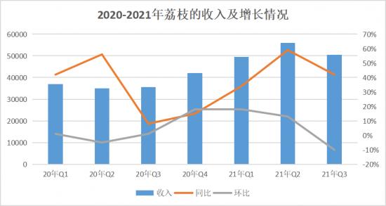 其次,虽然报告期内荔枝的营收数据同比增长了四成,但环比来看,其营收增速任然还需努力。