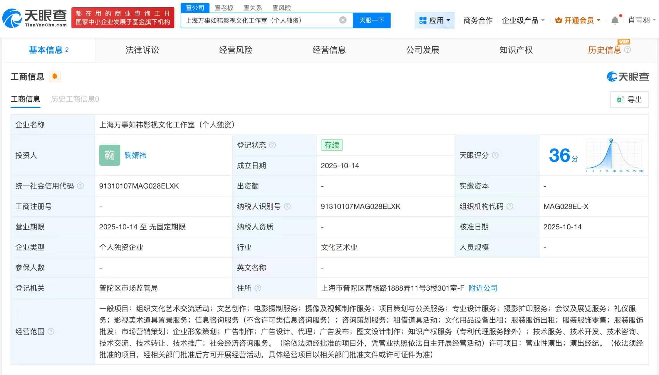 天眼查App显示,近日,上海万事如祎影视文化工作室(个人独资)成立,投资人为鞠婧祎,经营范围包含文艺创作、电影摄制服务、摄像及视频制作服务等。