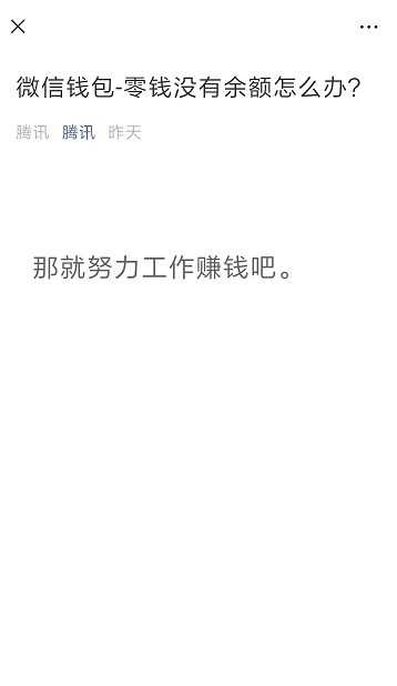 事情是这样的,“腾讯”官方公号昨日发布《微信钱包-零钱没有余额怎么办》一文,文章页面显示仅有“那就努力工作赚钱吧”9个字,且被标注为“原创”文章。