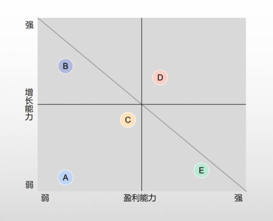 技术领域的“河界”不是既定的,由此我们以盈利能力为X轴,越往右说明盈利能力越强;以增长能力为Y轴,越往上说明增长效率越高,构建企业的技术发展坐标系。