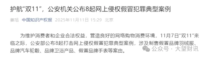 据中国知识产权报消息,公安部也在“双十一”来临之际,公布了8起打击网上侵权假冒犯罪典型案例,涉及制售假冒品牌羽绒服、品牌汽车轮毂、品牌卫浴产品、假冒品牌手表等案由。