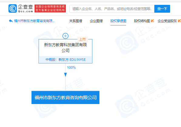 企查查股权穿透显示,该公司由新东方教育科技集团有限公司全资持股。