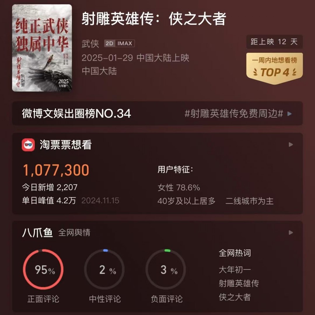 《射雕英雄传》是家喻户晓的头部武侠IP,由此改编的《射雕英雄传·侠之大者》由徐克导演、肖战担纲主演,情怀和流量兼备。不过,往年武侠片很少出现在春节档,这一类型的影片在春节档的潜力尚无从检验。根据淘票票想看数据,《射雕英雄传·侠之大者》吸引的路人盘不及预期。通常来说,武侠片对男性观众有着更强的吸引力,该影片女性观众占比高达78.6%,是春节档6部影片中女性观众占比最高的,甚至超过了《熊出没·重启未来》,目前来看主演粉丝群体依然是观影主力,后期如何吸引更多路人盘还要看上映后的口碑表现。