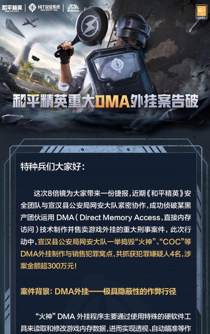 【TechWeb】5月20日消息,今日,腾讯游戏安全中心官方公众号发文称,《和平精英》安全团队与宣汉县公安局网安大队成功侦破某黑产团伙运用DMA技术制作并售卖游戏外挂的重大刑事案件。