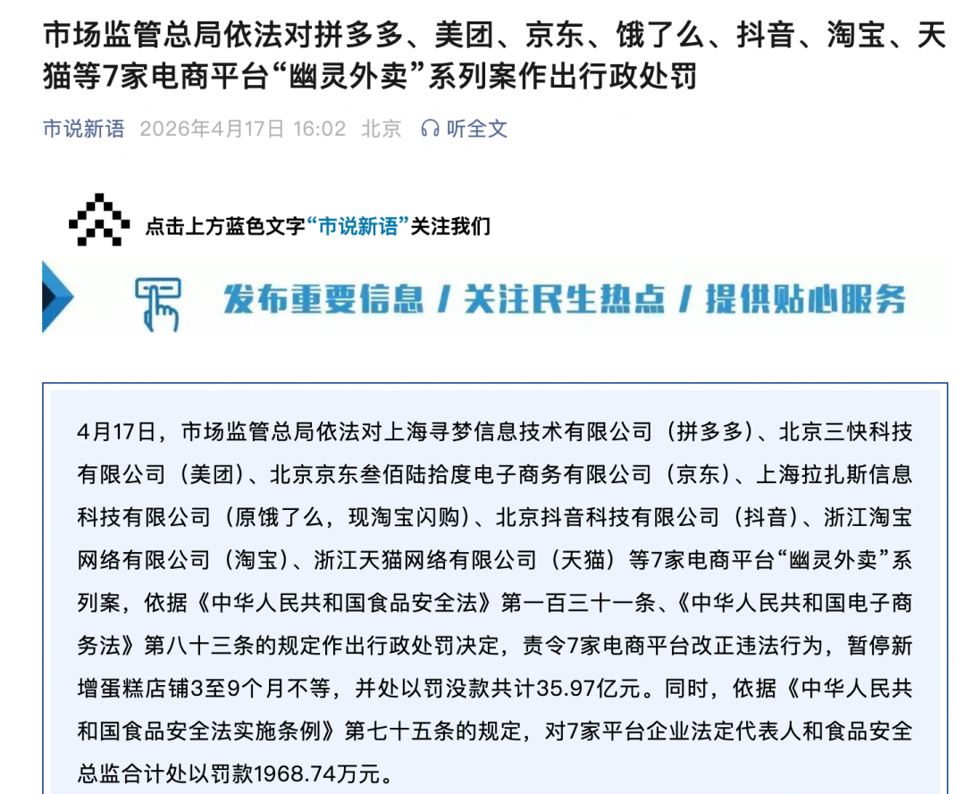 据国家市场监管总局官方公众号消息,今天,市场监管总局依法对上海寻梦信息技术有限公司(拼多多)、北京三快科技有限公司(美团)、北京京东叁佰陆拾度电子商务有限公司(京东)、上海拉扎斯信息科技有限公司(原饿了么,现淘宝闪购)、北京抖音科技有限公司(抖音)、浙江淘宝网络有限公司(淘宝)、浙江天猫网络有限公司(天猫)等7家电商平台“幽灵外卖”系列案,依据《中华人民共和国食品安全法》第一百三十一条、《中华人民共和国电子商务法》第八十三条的规定作出行政处罚决定,责令7家电商平台改正违法行为,暂停新增蛋糕店铺3至9个月不等,并处以罚没款共计35.97亿元。