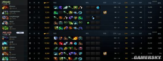 不过纵然局势劣势,Ame中期依然通过扎实的Farm功底将经济保持在全场第一。局势拖入后期,在拥有了装备的大小娜迦的成长性自然毋庸置疑,PSG.LGD渐渐扭转局势。