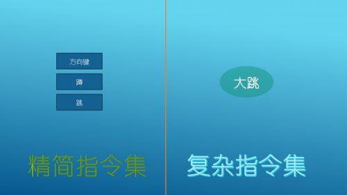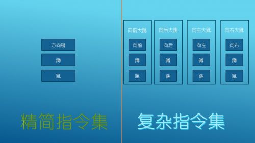 对于精简指令集来说,实现“大跳”这个动作需要按“蹲”、“跳”和一个方向键(前后左右)。而对于复杂指令集来说,大跳就是一个指令。精简指令集很多时候是把复杂指令集的指令拆散了。这样乍看一下好像精简指令集比复杂指令集还复杂了。